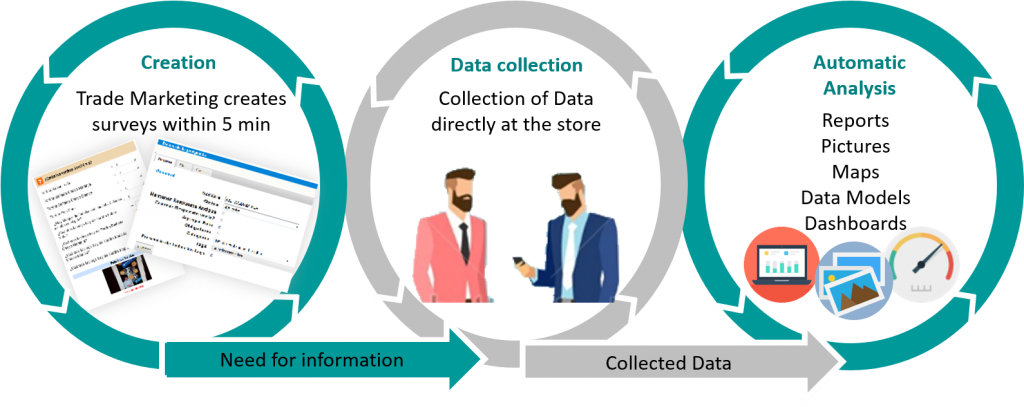 The answers of the sales representatives are saved when closing the visit and are available at the head office at the same moment.