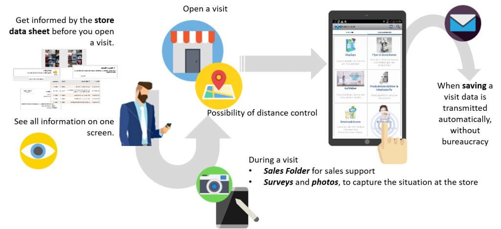 This has two major advantages: On the one hand it comes to a reduction of bureaucracy and office work and therefore sales representatives have more time for visits. On the other hand the office staff gets a real time overview of the current point of sale situation.