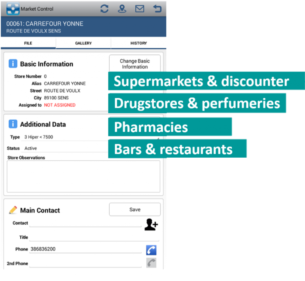 A collection of points of sale with all necessary information (customer data, geographic location highlighted on a map and notes left from the sales representative at each visit) is always available.